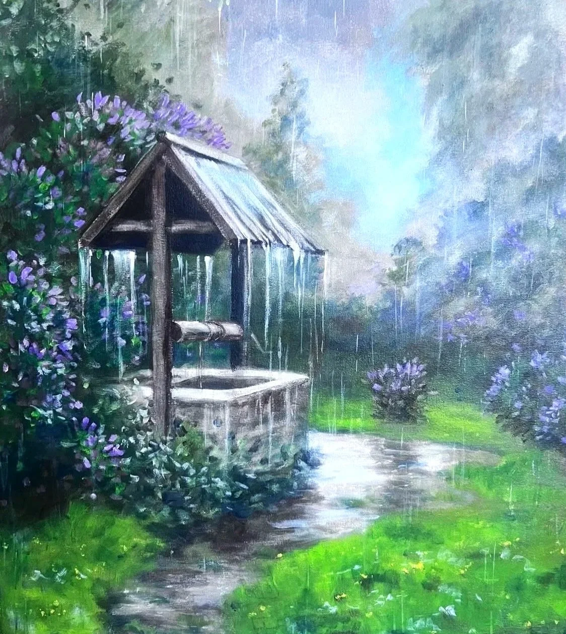 Wir malen ein Regenbild in Aquacryl. Das ist eine Technik, in der wir Acrylfarbe mit viel Wasser verlaufen lassen, so ähnlich wie beim Aquarell. Daraus formen wir eine Landschaft mit Wolken, Nebel, vielleicht einem Brunnen, Bäumen und Sträuchern. Schön wären auch Butterblumen im nassen Gras und Pfützen auf dem Weg.